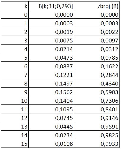 ![Rendered by QuickLaTeX.com \[ n = 31, \, p = 0,293, \, q = 0,707 \] \[ P(X=k) = \binom{31}{k}\cdot {0,293}^{k}\cdot {0,707}^{\,31-k}, \qquad k=0,1,\dots,31. \] \[ \mathbb{E}[X] = n\, p = 8,99 \] \[ \mathrm{Var}(X) = n\,p\,q = 6,4 \] \[ \sigma = \sqrt{\mathrm{Var}(X)} = 2,5 \]](https://lanovic.eu/wp-content/ql-cache/quicklatex.com-4a36022b98f5f1c1900103700c4b8b9c_l3.png)