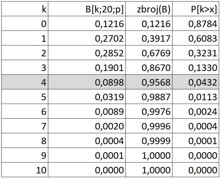 Excel nam nudi funkciju =BINOM.DIST pa jednostavno možemo doći do odgovora,