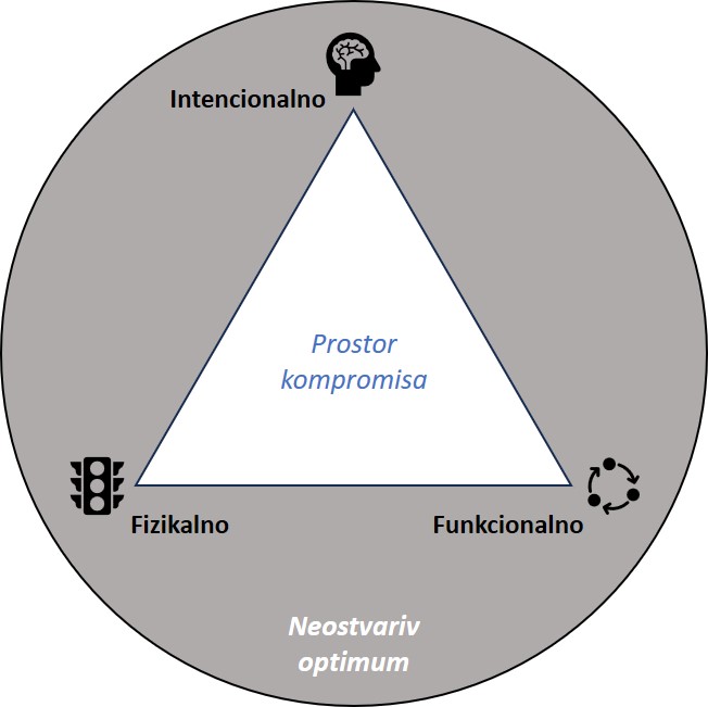 Zašto sam područje izvan trokuta nazvao neostvariv optimum? U geometriji ravnine to je moguća točka koja upućuje na sve tri komponente u maksimalnom iznosu: savršena fizikalna (infrastrukturna) izvedba, savršena funkcionalnost i 100 % društvena prihvaćenost. Stvarnost ukazuje da su resursi (novac, prostor, vrijeme) ograničeni, a različite skupine korisnika imaju različite (suprotstavljene) interese. Zato je prikaz trokuta napetosti vizualna i mentalna granica područja raspoloživog kompromisa.