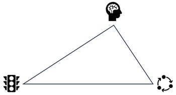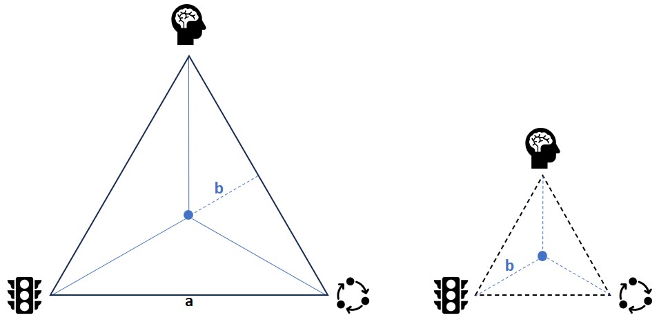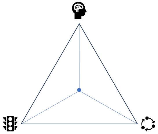 Trokut kao cjelina nam govori da rješenje treba tražiti (graditi) od činjenice dobre usklađenosti intencije s funkcionalnosti; ono što korisnici/dionici žele i planirano funkcioniranje sustava su (relativno) usklađeni. Fizikalna komponenta je kritična; infrastruktura i tehnologija teško će pratiti prate potrebe javnosti/dionika i funkcionalne zahtjeve. Budući da govorimo o trokutu napetosti, fizikalna komponenta je u najvećoj napetosti, dok intencionalna ima najveću težinu (prednost) jer pruža određenu širinu promišljanja (najveći kut u trokutu).