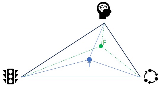 Postoji li još koja točka koja bi nam ukazivala na neki drugi i bolji pristup? Fermat–Torricelli točka je točka u trokutu sa svojstvom da je zbroj udaljenosti do sva tri vrha minimalan. Na slici je označena zelenom oznakom „F“. To je točka koja pokazuje gdje je ukupna „napetost“ trokuta minimalna, odnosno kao inženjer(ka) možemo reći da je to točka optimiziranog kompromisa u nekom prometnom realnom (kompleksnom, neravnomjernom) sustavu.