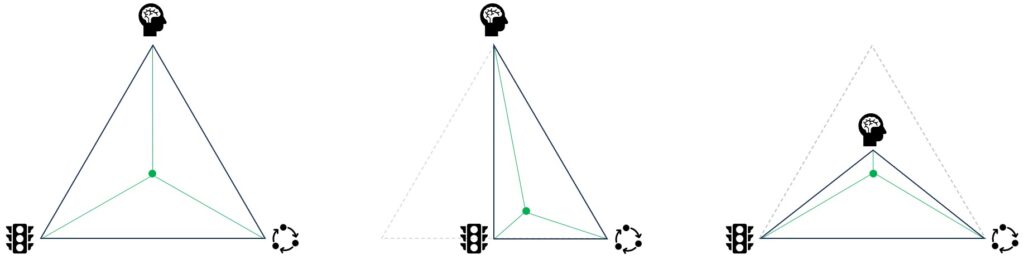 Imamo osnovni problem, recimo da imamo (ne)sreću da sve tri komponente imaju međusobno podjednake razlike i sukladnosti; istostraničan trokut lijevo na slici. Malo ćemo se “poigrati” odnosom fizikalnog i funkcionalnog (trokut u sredini na slici) pa ćemo prepoloviti prostor kompromisa, ili ćemo znakovito utjecati na intencionalnu komponentu (jednakokračan trokut desno na slici) pa ćemo isto bitno smanjiti prostor kompromisa.